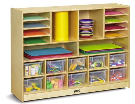 Make any area organized with this deluxe storage unit. With 12 open shelves in a variety of sizes and 10 included clear Cubbie-Trays, you can organize everything from paper to art supplies to manipulatives.
