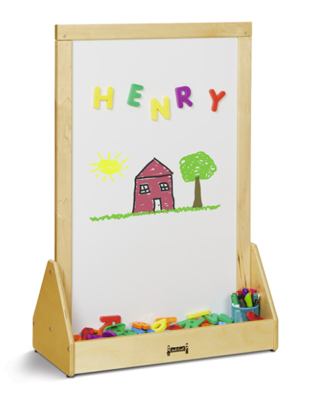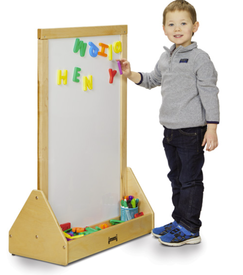 This standing board is the perfect height for children in Pre-K and features a double-sided Magnetic Write-n-Wipe panel for loads of creative fun! Children can spell out words with magnetic letters, draw their favorite pictures with dry erase markers, or explore their favorite STEM and STEAM activities with magnetic gears, levels, and other learning aids (not included). At the bottom of the board, there is a handy tray for storing these supplies as well as catching any falling items during experiments. The Magnetic Write-n-Wipe Panel is 20.5” wide x 31.75” high.