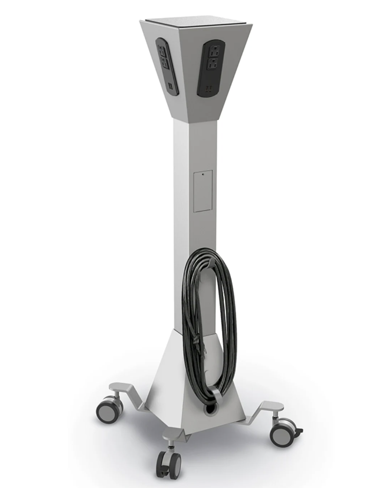Mobile tower provides instant AC outlet and USB charging access to multiple users in group seating arrangements.