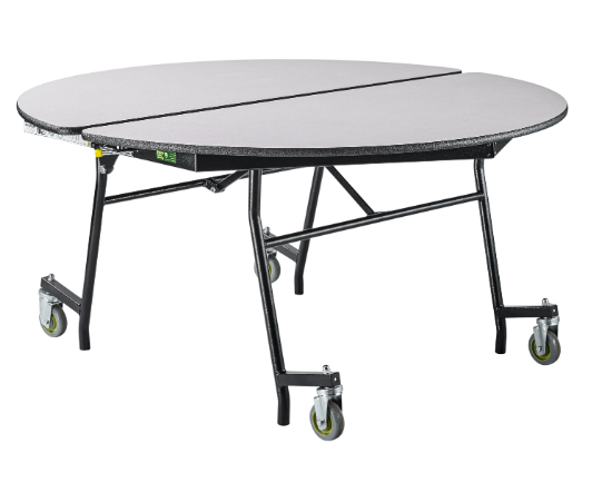 Mobile Shape Units from National Public Seating are the perfect solution for those who prefer to use separate chairs in their venue. Built on a solid 14-gauge steel frame with tamper-free hardware, tabletops are protected with a high pressure laminate top and a phenolic backer sheet making them power washable. Our caster lift-off safety feature prevents the table from moving while open. Storage latch release handles are easily accessible from both sides of the table without having to reach in. The storage latch automatically locks when folded for safety. Tables operate smoothly and safely thanks to the NPS EasyLift torsion bar system. The self-leveling automatic down lock engages at a partially opened position for safe, easy cleaning and again at the fully opened position. Available in a variety of shapes, wood cores, color finishes, edge protections and frames.